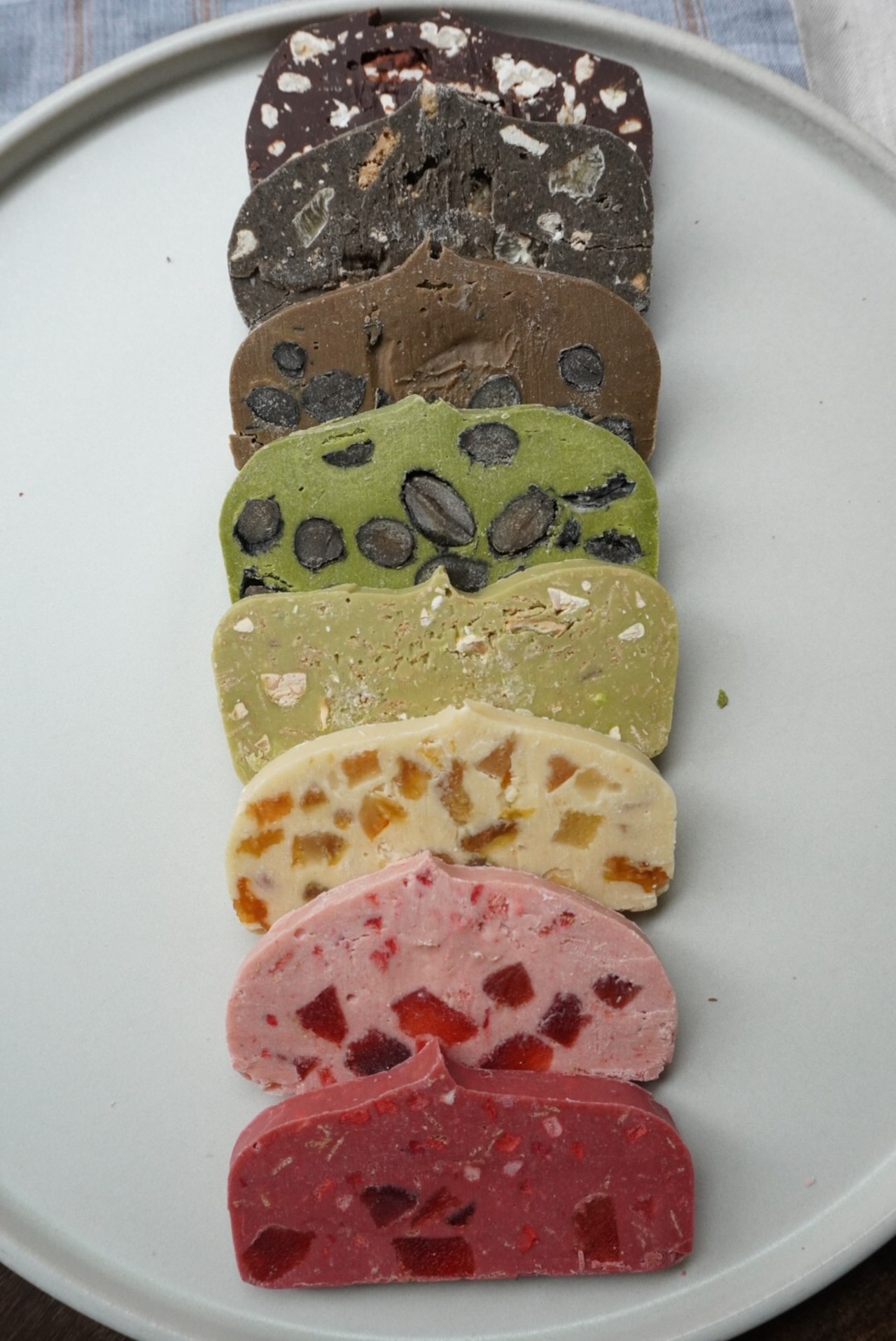 (リッチベリー、ベリーベリー、ホワイト、ゆず、抹茶、ほうじ茶、京番茶、アップルティー、ミルク、ノアール、焦がしきな粉、ペカン55%ココナッツベンチェ、ペカン56%、ペカン62%)の中から8種のフレーバーをセレクトしてお届けいたします。